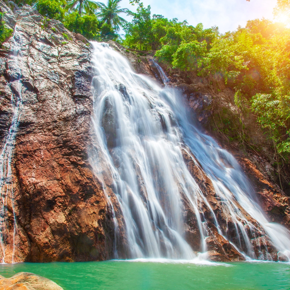 Na Muang Waterfall 1 – Admire the impressive falls from below, swim, and jump from the large rocks.