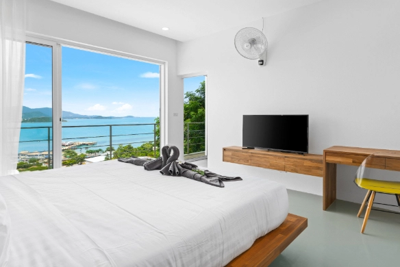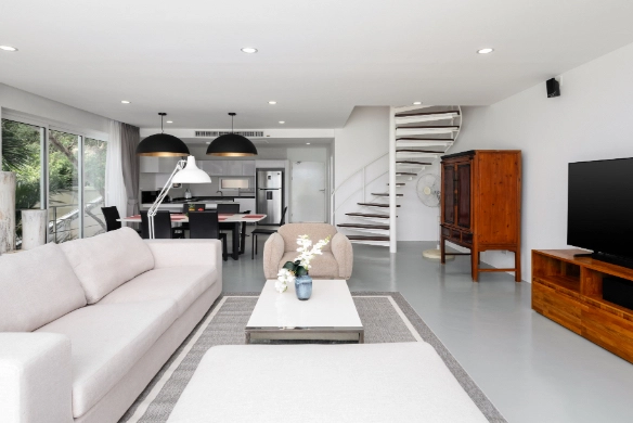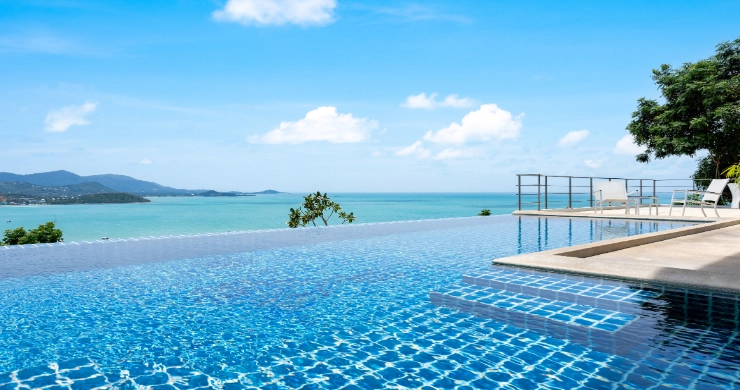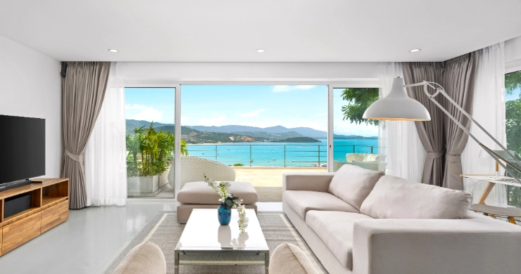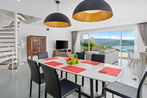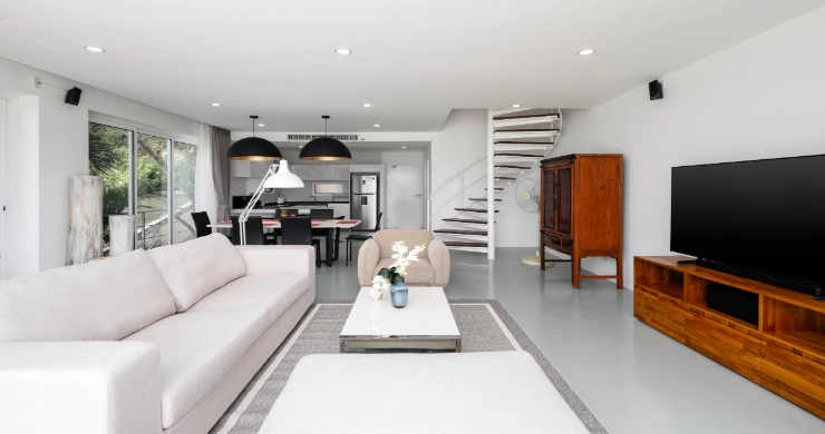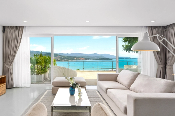 This duplex apartment for sale is situated within an award-winning resort development on the Big Buddha hillside in the popular North-East of Koh Samui. Featuring a contemporary chic design with panoramic, close-up sunset ocean views towards Koh Phangan, the apartment is just 200 meters from the beautiful Bangrak Beach.
